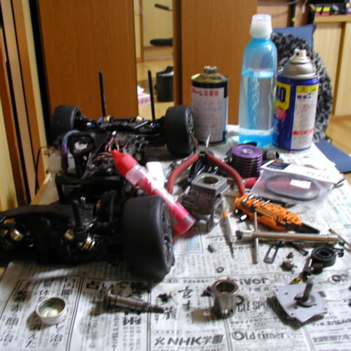 M藤車のエンジン。オーバーホール。 京商 Pure10、タミヤTG-10等が主流のなか、彼はHPIの1/8車を導入した。 エンジンは非力、...