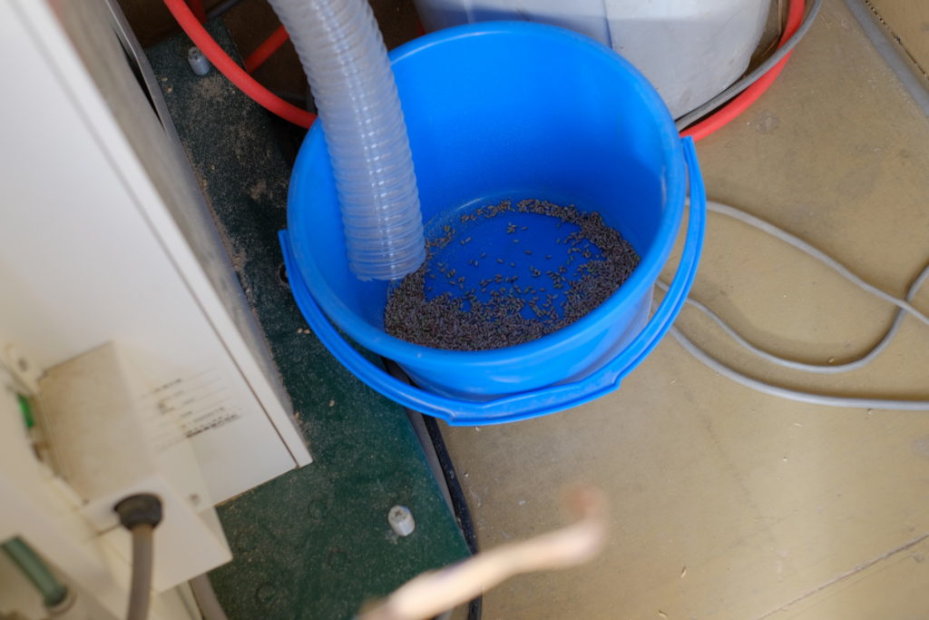 避けられた不良認定された玄米は床置きバケツに集められた。
