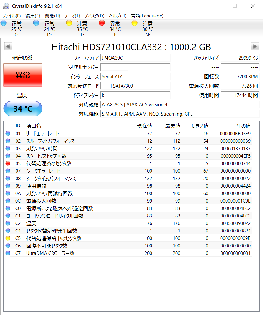 BIOSでSMARTエラーが表示されるようになったのでCrystalDiskInfoでHDDの状態を確認すると、異常表示、生の値もリアルに増えていた。