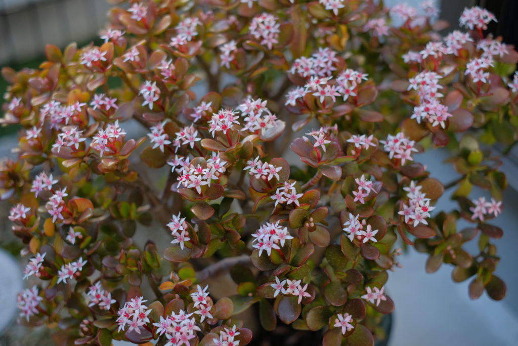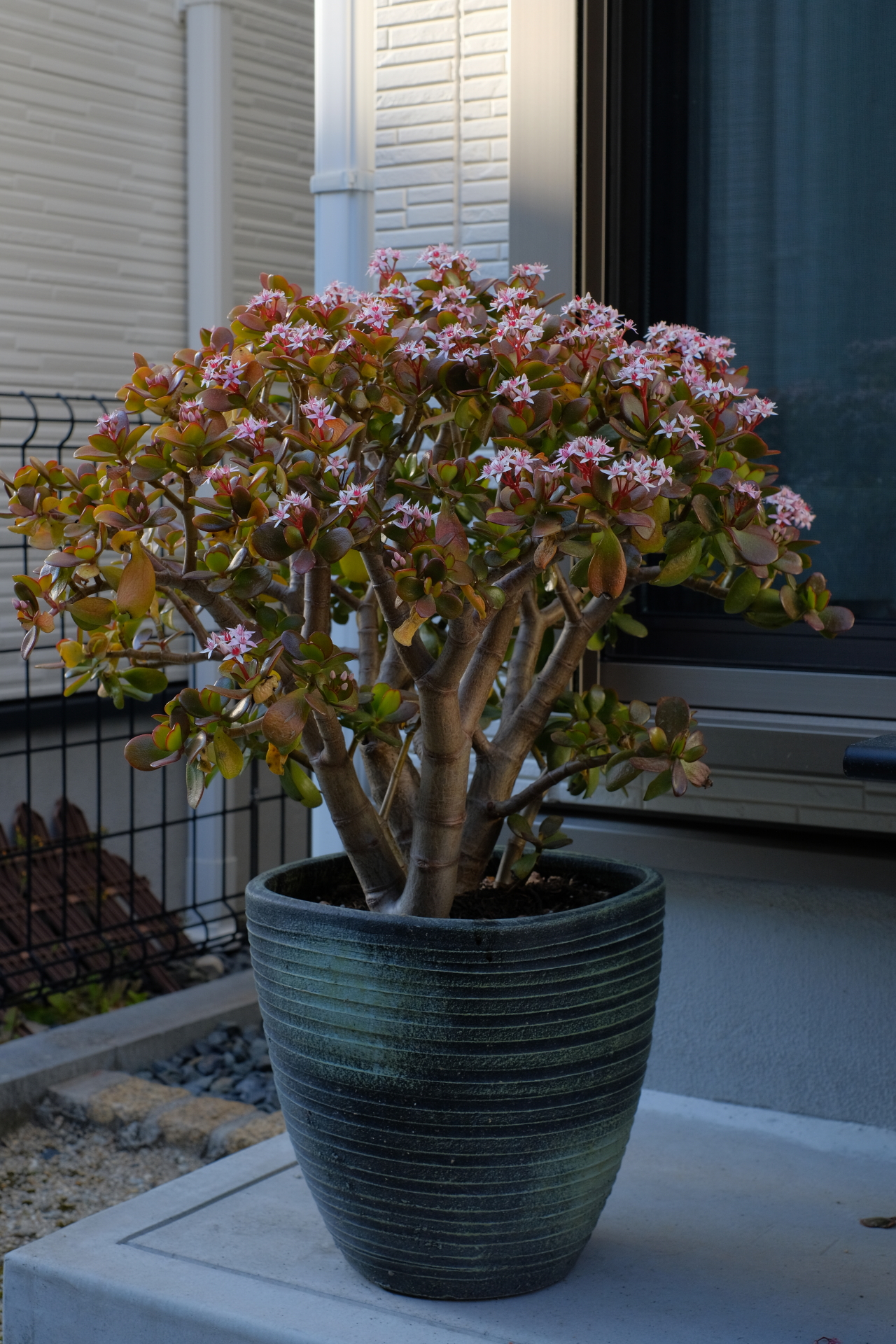 ホーム > 家 金のなる木(花が咲いた) 成金草ともいわれる和名「フチベニベンケイ」という多肉植物。 何年も前から育てている。 ある年には葉を落とし枯れたかと思ったりもしたけれど、南側の日当たりのよいところに置いておいたら、大復活を遂げた。 この植物は、水をあげないと花を咲かせてくれる特性があるらしい。屋根のあるところなので、あまり雨がかからず、結果、この3月に満開の様相となった。 男らしい幹の頭上に華麗な花たちが踊る まるで梅林のようだ 地味な葉の形をしているので、花が咲かないとただの緑色の葉っぱの集合体。 これだけ開花するとまるで印象が変わる面白い植物だ。 カテゴリー:家 前の投稿 春の陽気 次の投稿 春は何処へ