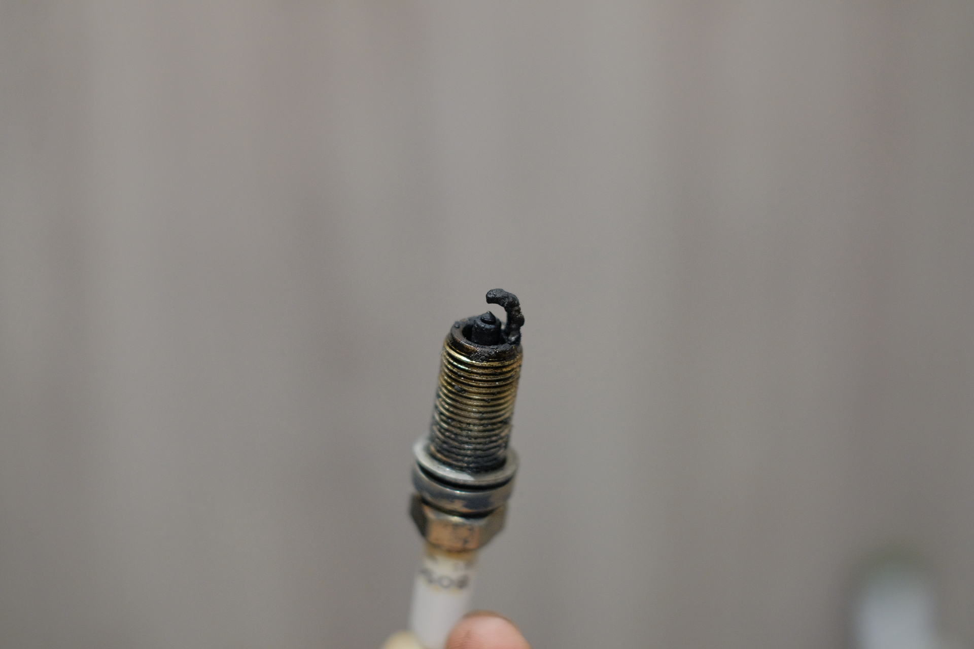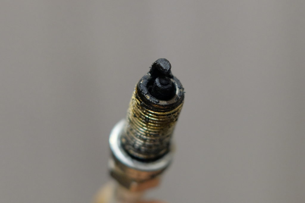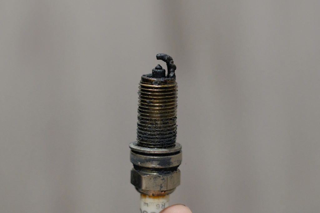 プラグホールにはカーボンのようなものがたくさんあった。締付不良ではないはずだが、プラグを外してみるとありえない状態になっていた。