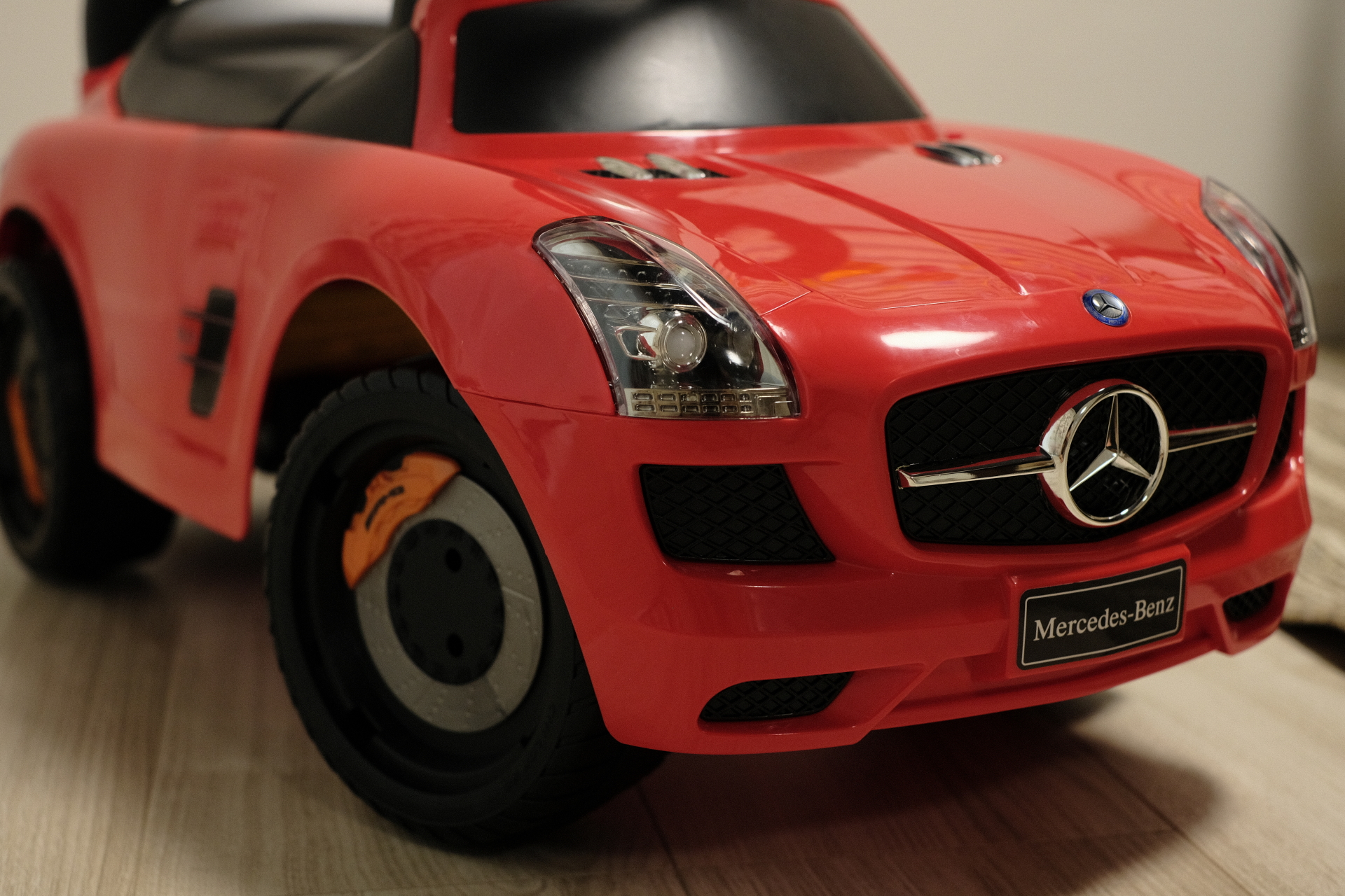 息子は、対面したらすぐにあろうことかホイール(キャップ)を外してしまった。あぶないので外しておくことにする。便宜上、キャリパーはタイヤと一緒に回転するようになっている。