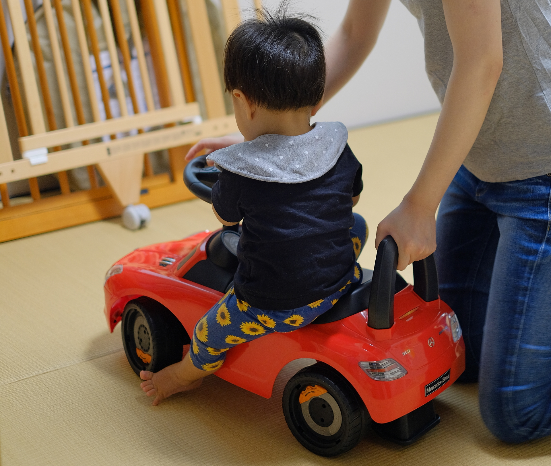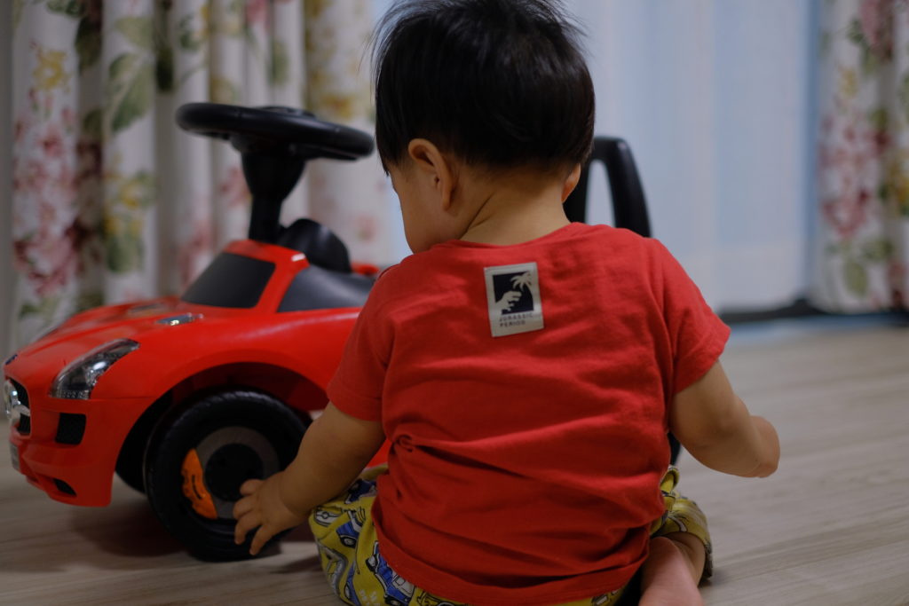 このクルマは対象年齢3歳以上。息子はまだ1歳。危ないのでいったん乗ってもらったが、しばらく車庫にしまっておくことにする。