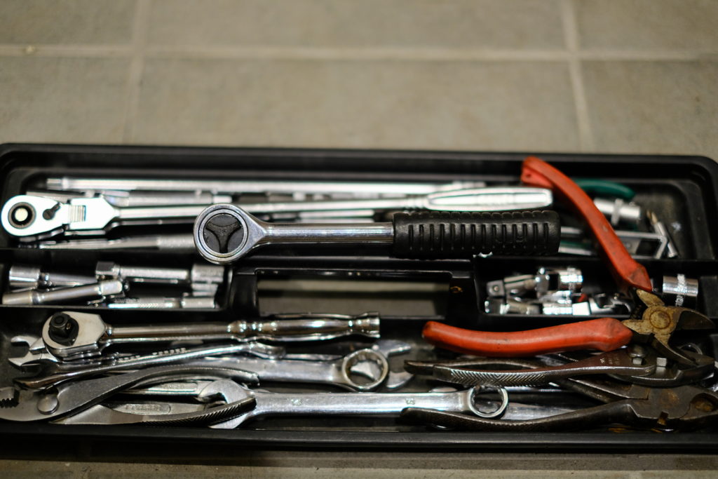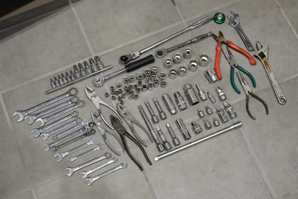 似たようなものが多い。同じ長さのエクステンションが4つ、ソケットもだいたい2つずつ各サイズある。メガネレンチも。このあたりはじいちゃんからごっそりもらったものかもしれない。