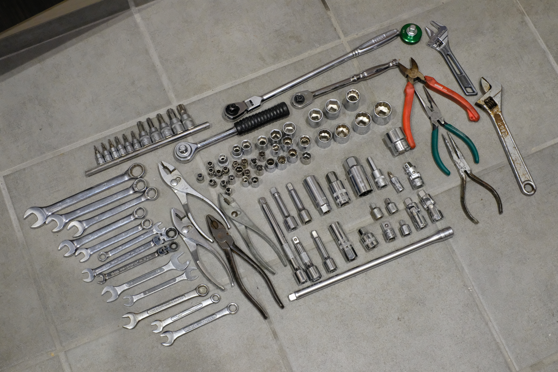 オヤジから引き継いだモンキレンチが錆びついていたのでWD-40で処理、ついでに工具箱から駆動工具類を中心に取り出し、並べてみた。