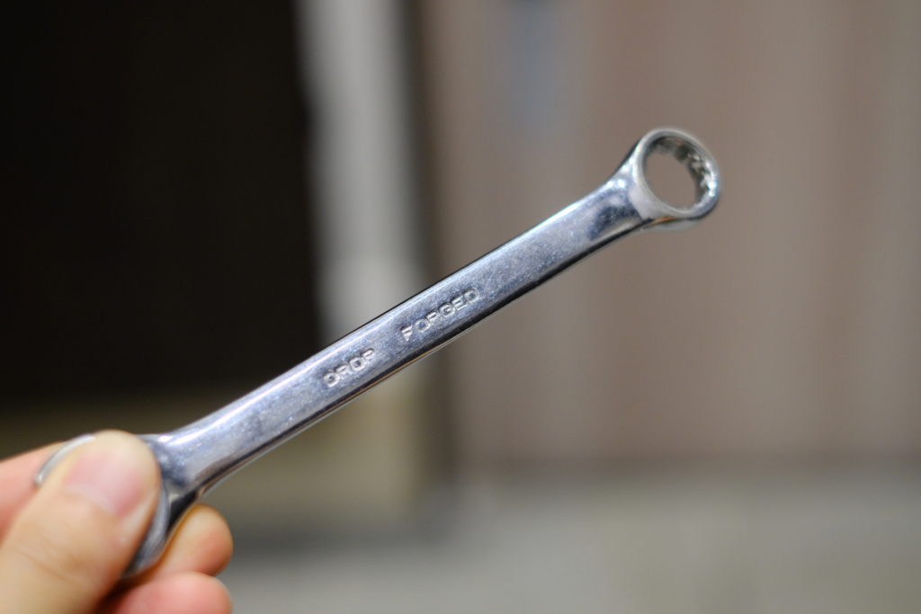 鍛造と誇らしげに書いてある安物のレンチ。若干のオフセットがジャッキアップした狭い空間で回すオイルプラグと親和性が高く、重要な場面での人間トルクレンチの一翼を担ってきた。お気に入りで数年に一度、ピカールで磨いたり、無駄にシュアラスターワックスを塗ってピカピカにしている。