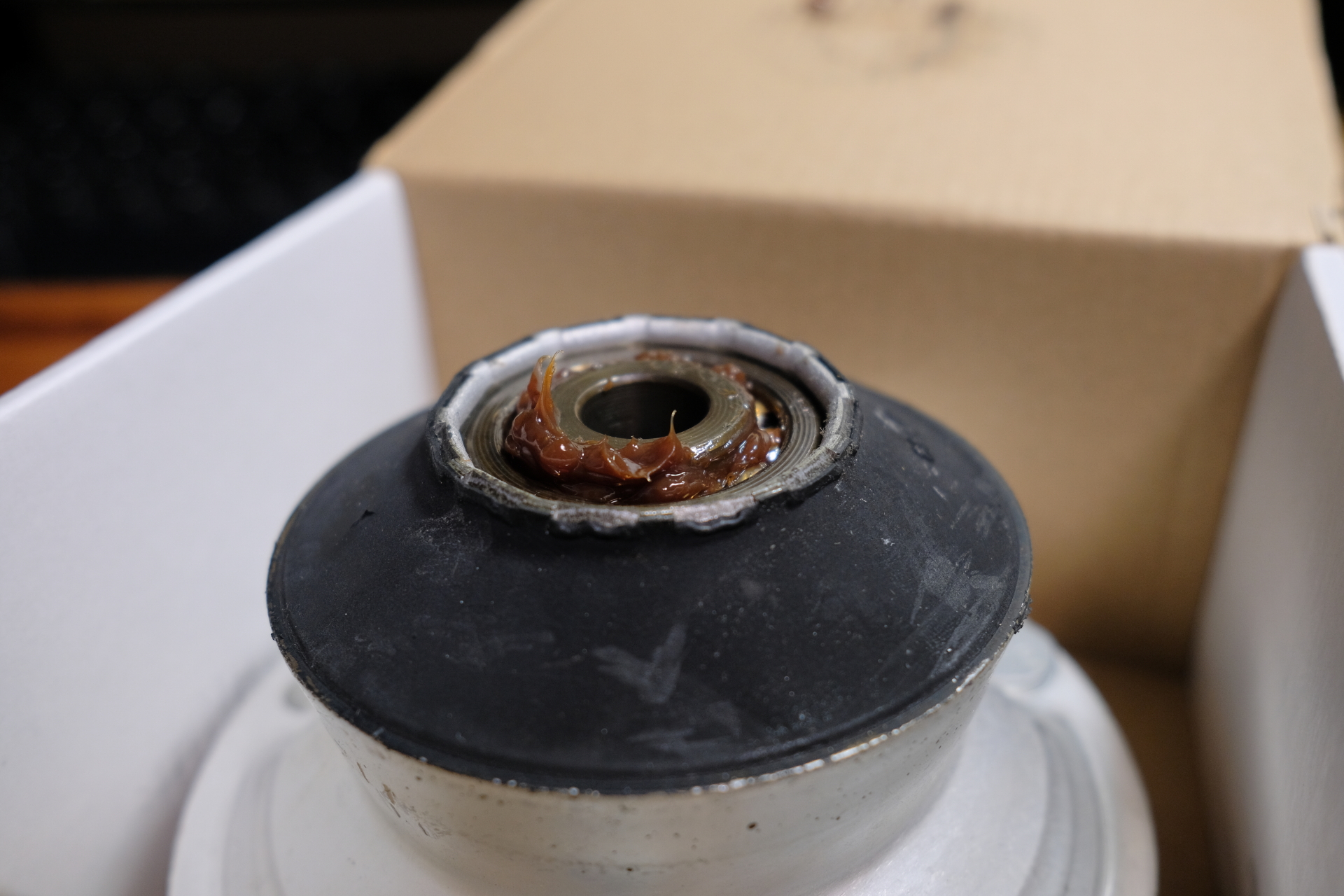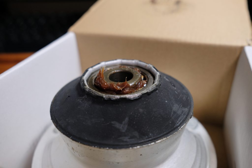 ベアリングがセンターにあるアッパーマウント。ピロアッパーにでもしない限り気にすることもないかもしれない。しかし、下手するとボンネットを破損することになるほど奥が深い(重要な)製品だ。