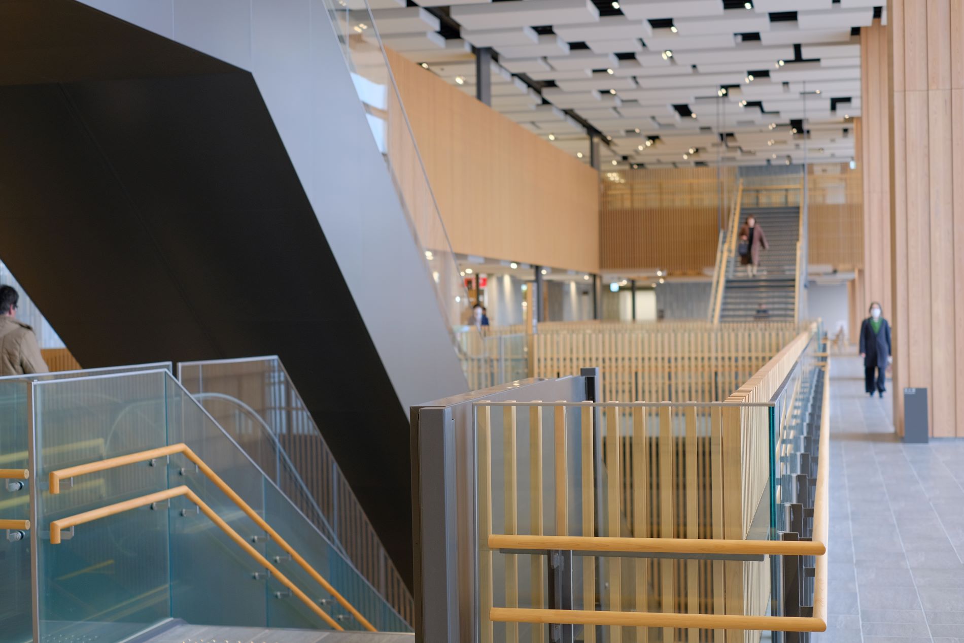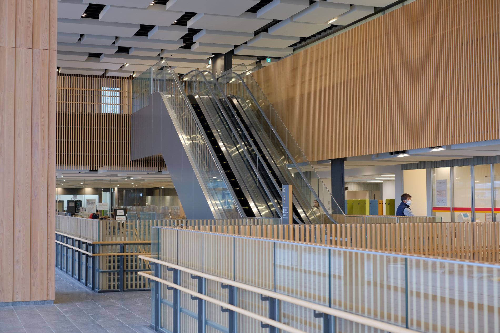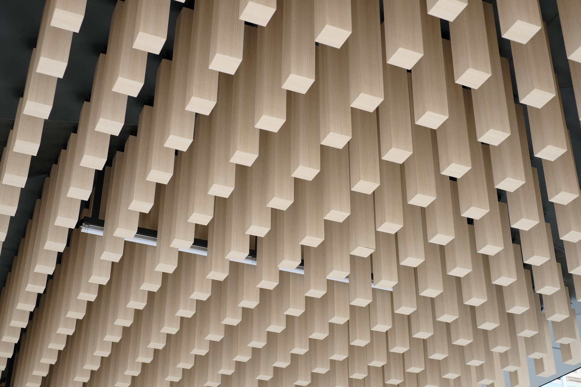岐阜県産ヒノキを使用した格子で埋め尽くされている。ヒノキからこれほどの圧倒的存在感を感じたことは、これまでになかった。