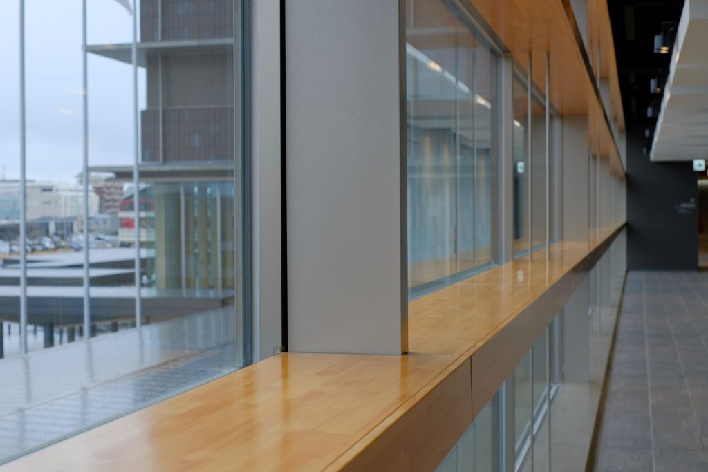 外壁ガラスには木製のカウンターのようなものが通しで設置してあり、どこでもスタンディングミーティングができる環境となっている。(そのためかは知らないが)