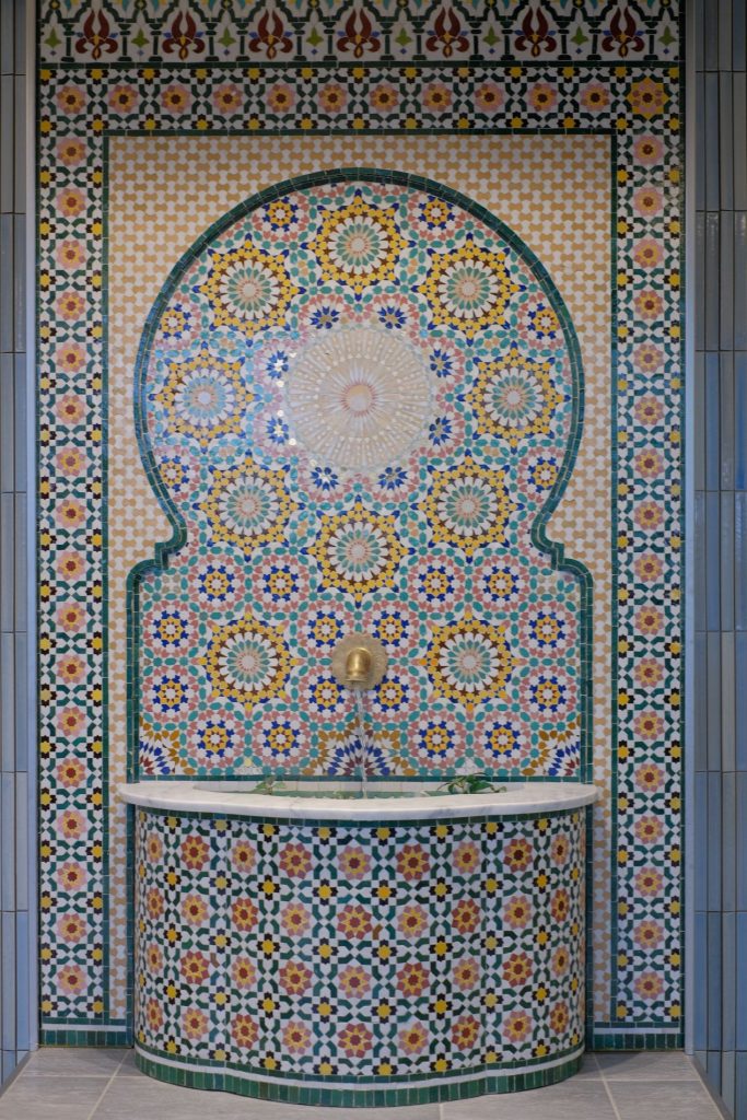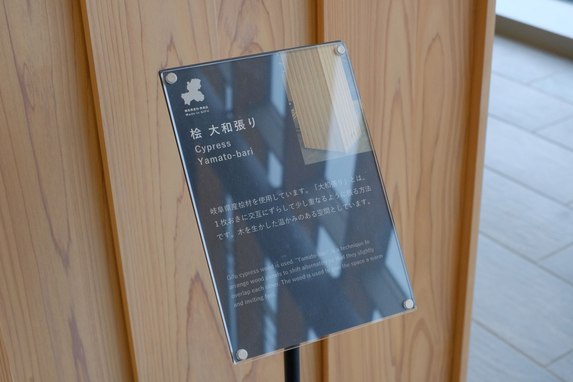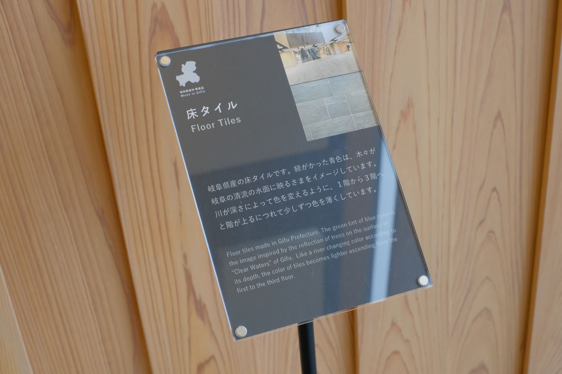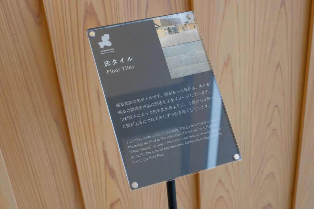 壁面にはタイルが貼られている。3種類の形状の岐阜県産タイルを組み合わせ岐阜県の「清流」を表現しているらしい。