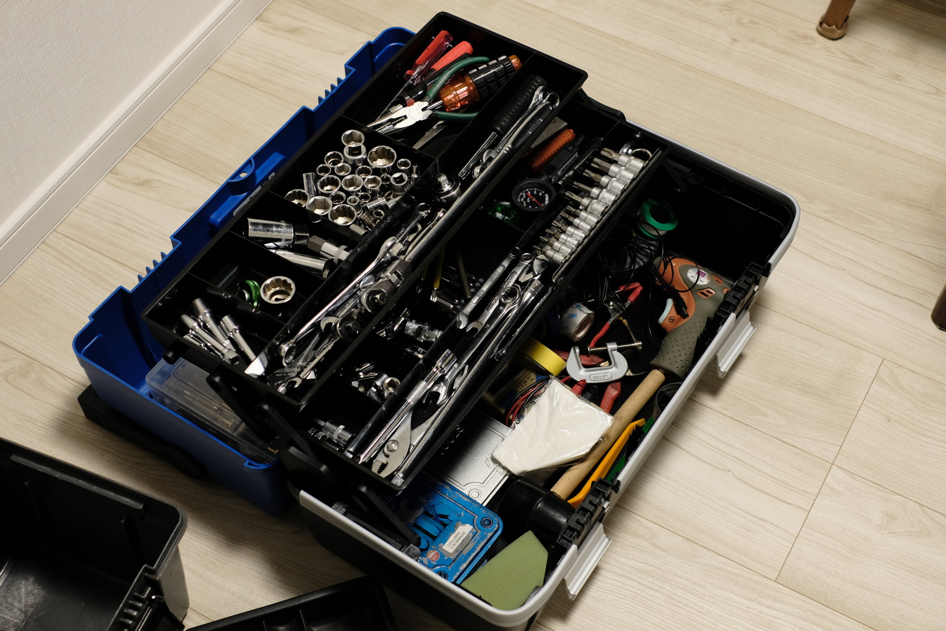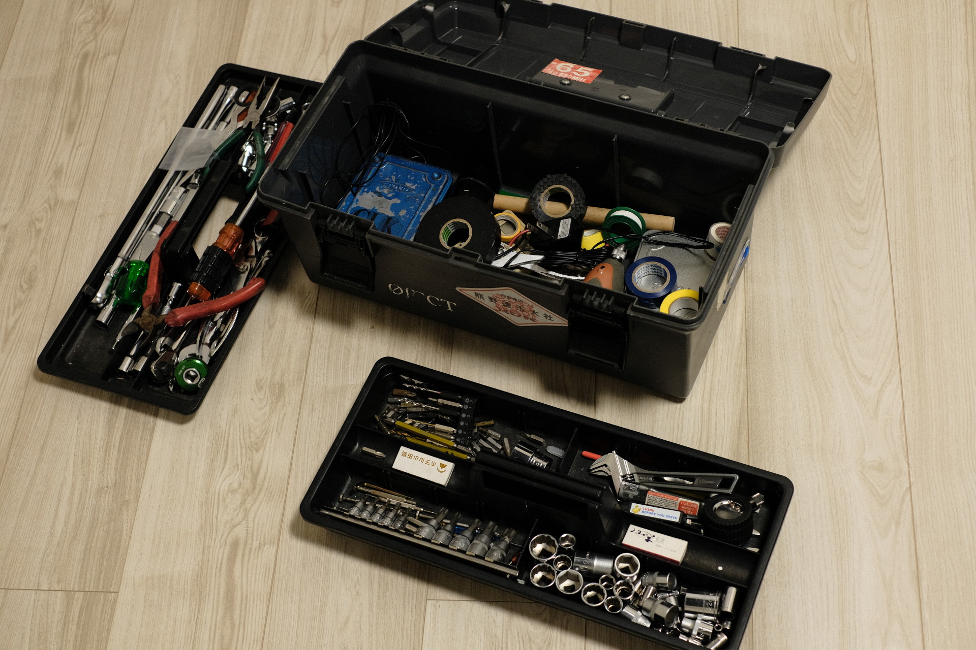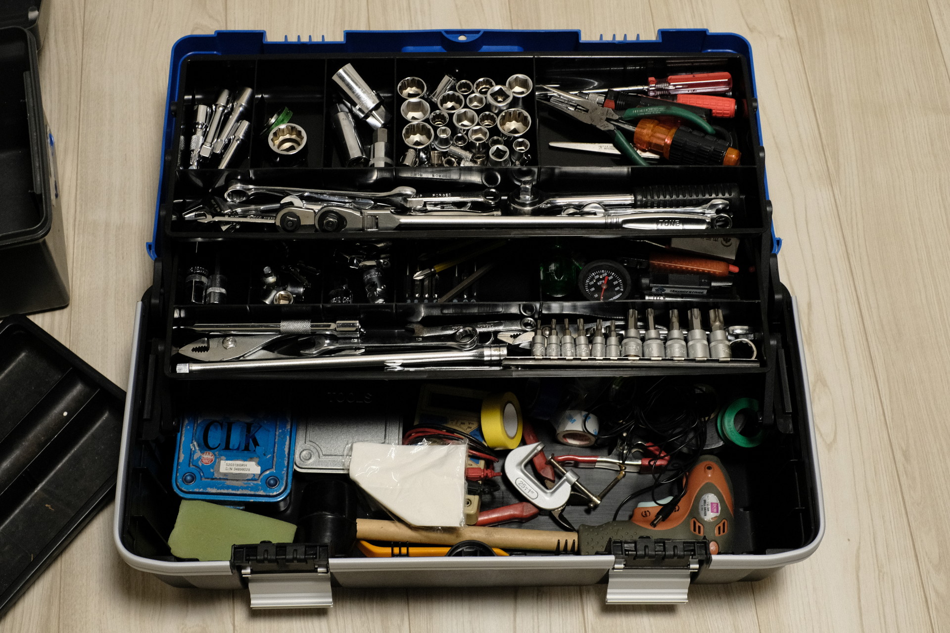 この工具箱はなかなか特殊で、ふたの裏っかわに小物入れが3つぶら下がっている。ありがたいが、いつか蓋が開いて大変なことになりそうな気がする。