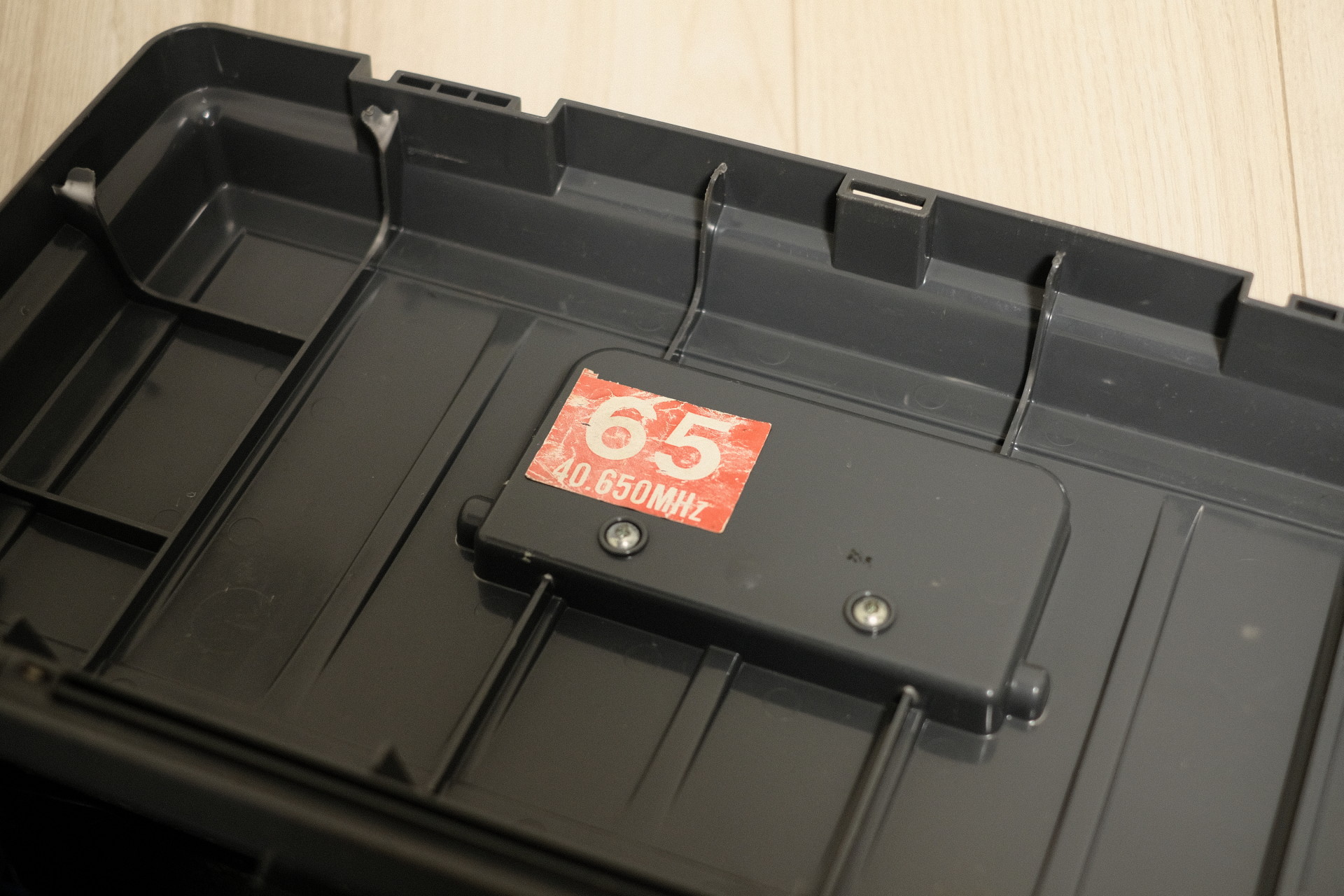フタの裏側に貼ってある「65」のシールは、双葉電子工業製プロポ「MEGATECH FM」のクリスタル付属周波数シールだ。当時モノ。