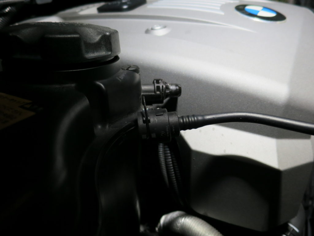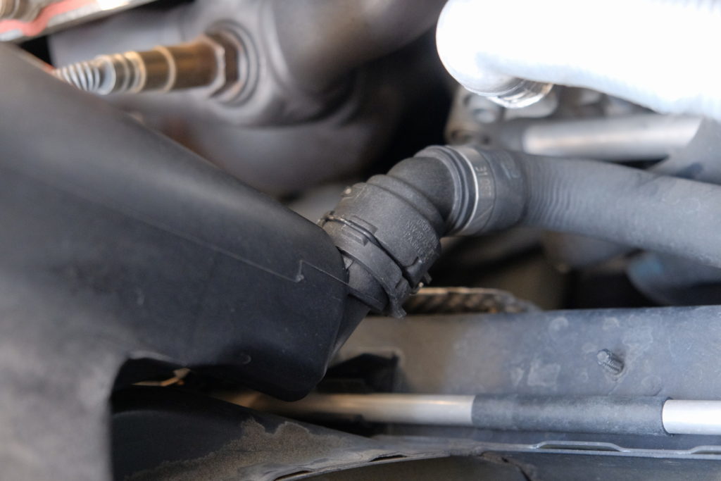 ホースが2つ繋がっているので引き抜く。裏側にある冷却水レベルセンサーのコネクタも同様。