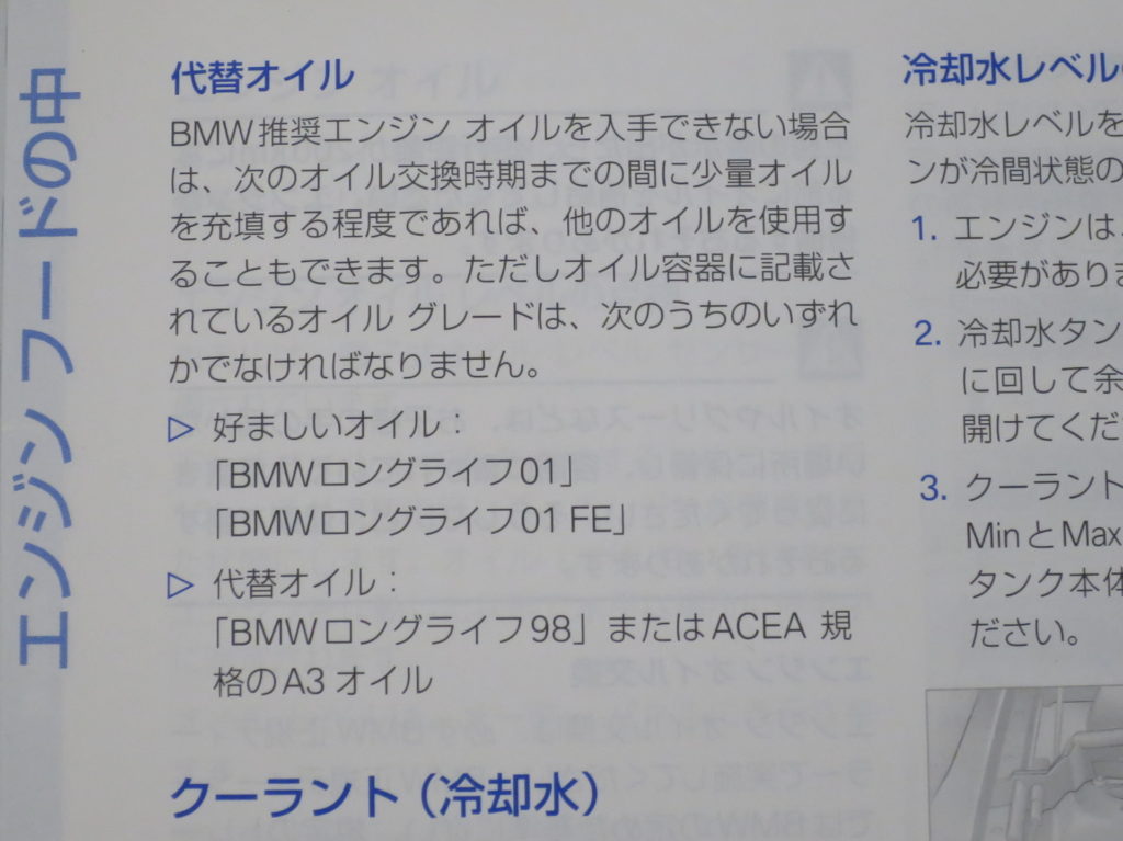 高価なBMW純正オイルを使用せよという厳しい条件。ここ数年どれにも合致しない安価な5W-40を放り込んでいたが、改心して久しぶりに認証オイルを使うことにした。