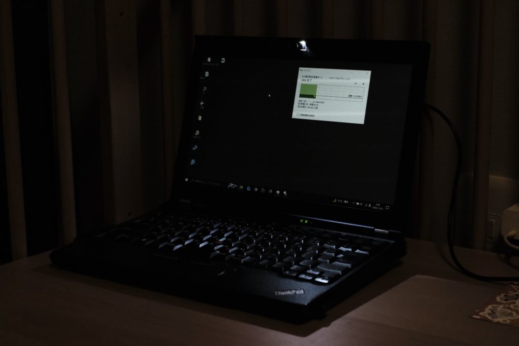 X220には液晶パネルのベゼル上部、カメラホール横にLEDが埋め込まれている。ショートカットキーひとつでLEDがキーボード全体を優しく照らすように下向きに光る。ちなみに液晶の照度もかなり暗くできるので暗闇操作は容易。