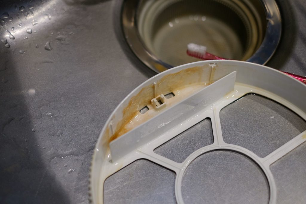久しぶりに分解すると、水受けトレイはヌメヌメ、とても汚なかった。フィルターも枠から外してしっかり洗っておいた。