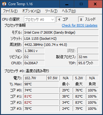 ホーム > その他 周波数の決定 試行錯誤していたが、最大のクロック数を決定。 4.4GHzが精神衛生上、安定するのでこれにした。 30本くらいの動画エンコードをする仕事があったので1時間動かしたが、さすがにこれくらいでは安定している。 ケース内には計9個のファンがある。クロック数に応じて回転数が可変するので、ずっと元気に回りっぱなしだ。 カテゴリー:その他 前の投稿 モノづくり国の衰退 次の投稿 キハ75