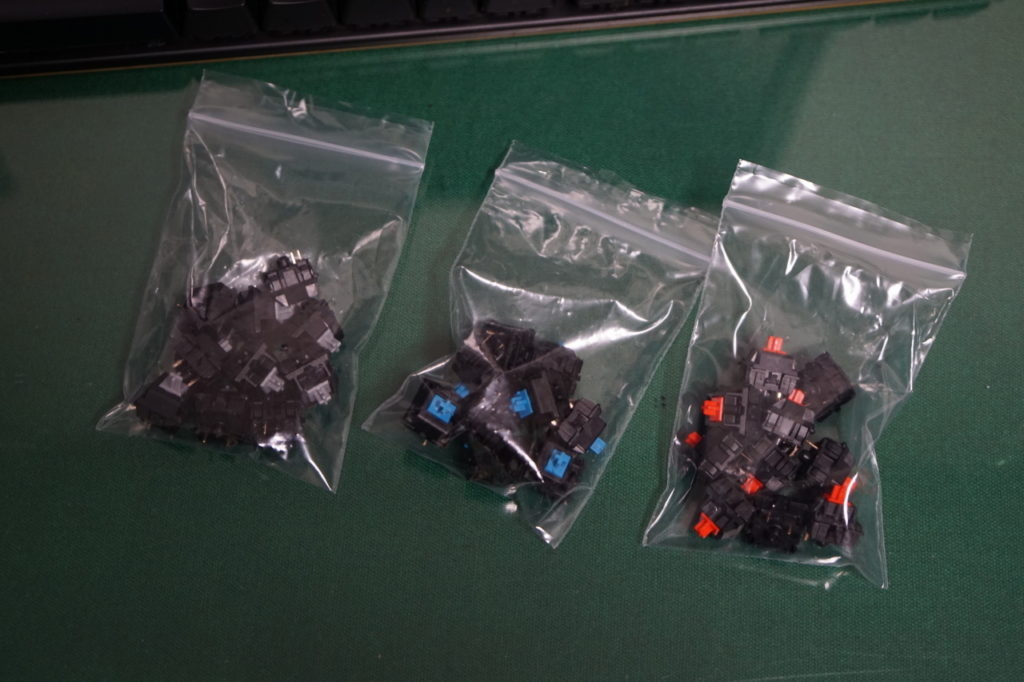 また、せっかくなので、自分好みに(半分遊びで)スイッチの種類を混ぜ合わせ、カスタマイズした(ちなみに、交換作業はハンダごてが使えれば簡単にできる程度の作業)。