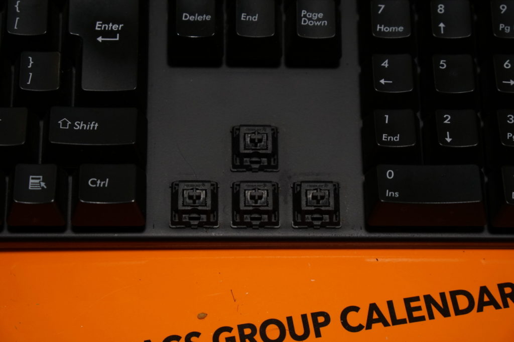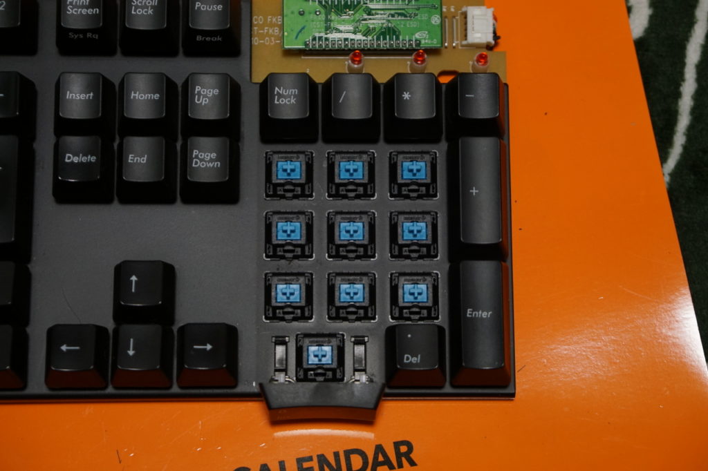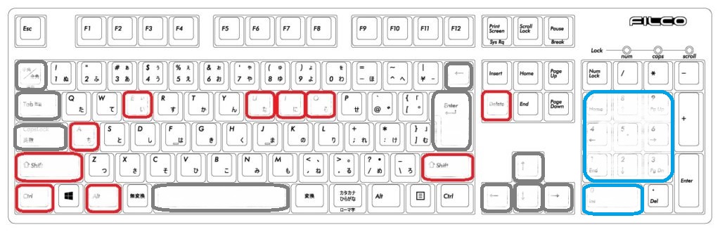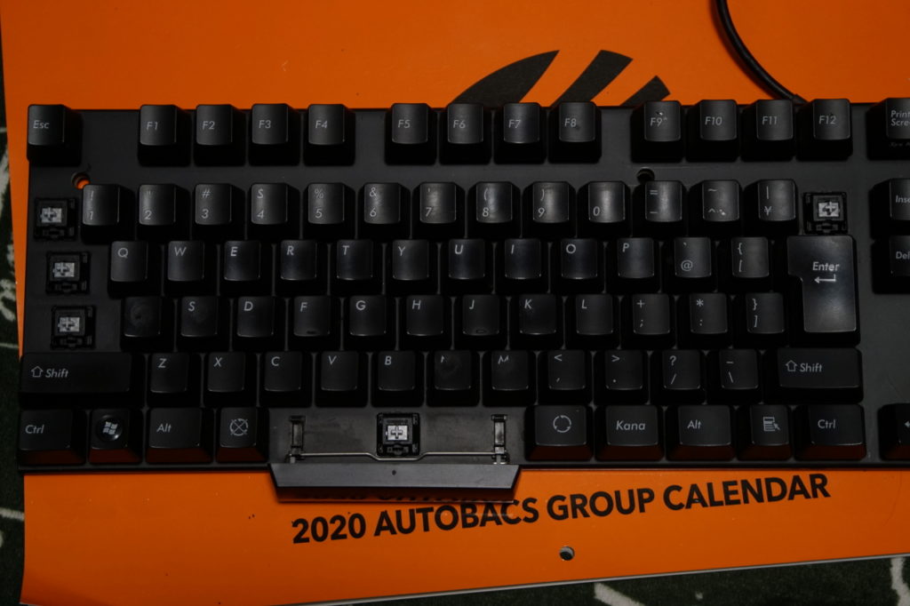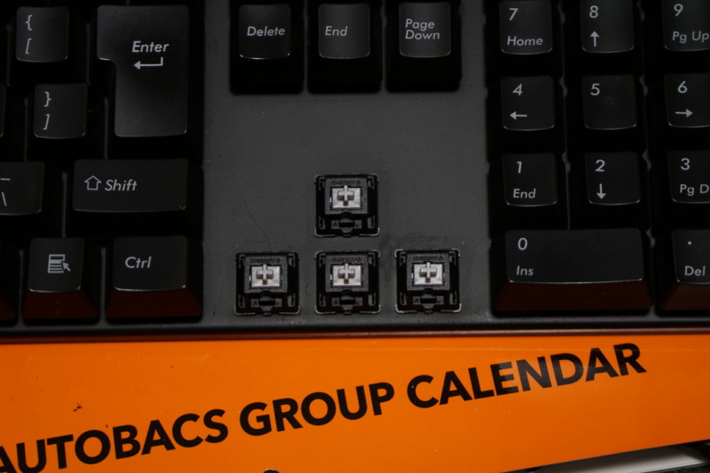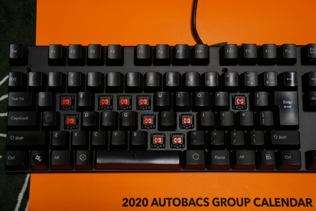 文章入力で良く押し込むキーに「赤軸」、なんとなくテンキーに「青軸」、小指や親指で軽く押し込みがちなキーにゲーミング用「銀軸」を配置した(他は「黒軸」のまま)。