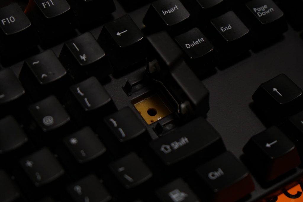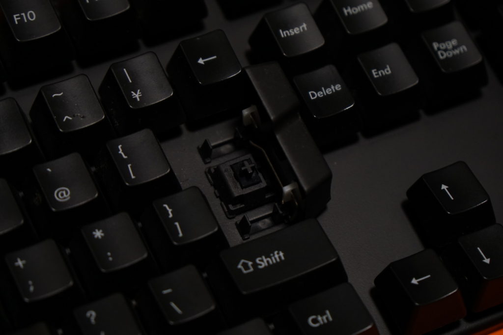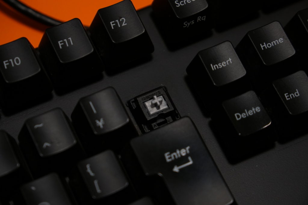 - 銀軸は、ストロークが短く軽く押し込むだけで反応する。ゲーミングキースイッチと呼ばれるとおり、斜めからでも軽く押し込んで反応してほしいキーに当てはめれば操作感はかなり好ましくなる。