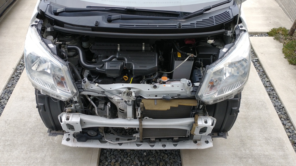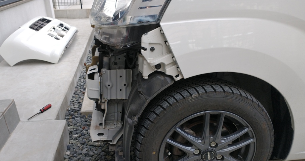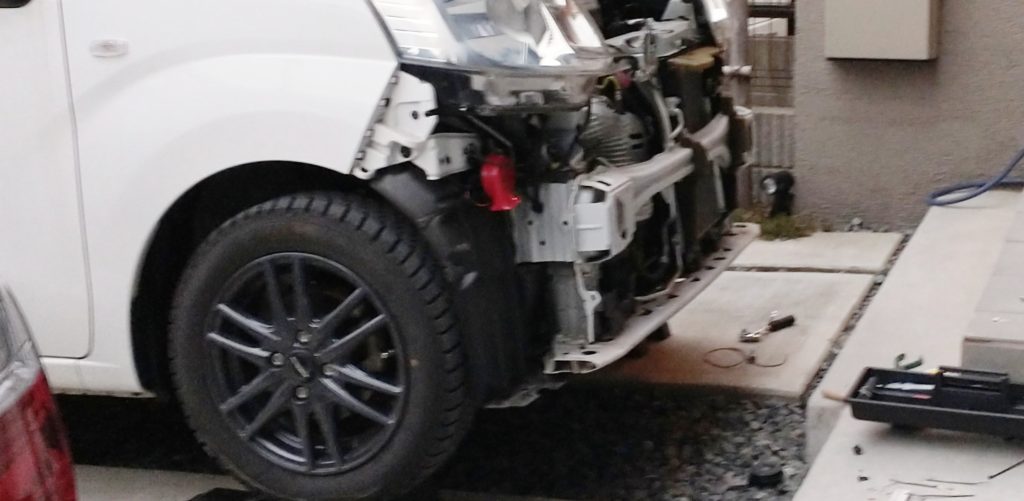 交換する軽自動車はバンパーを外さないと作業ができないので、まず、フロントバンパーを外す。