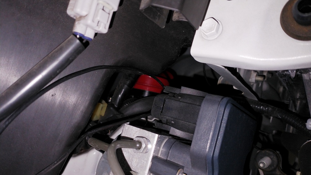 左右ともにステーを使わずに取り付けたため、ホーンの後ろ側がタイヤハウスカバーと軽く接触