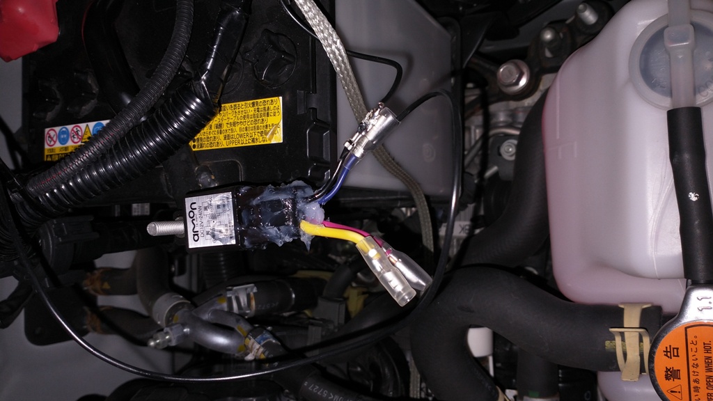 安いエーモンの非防水リレーに手持ちのコーキング材をまぶし、防水対応とした。