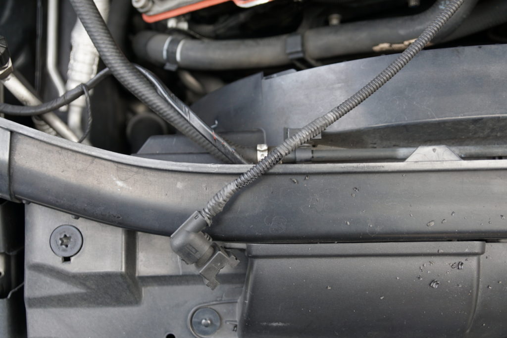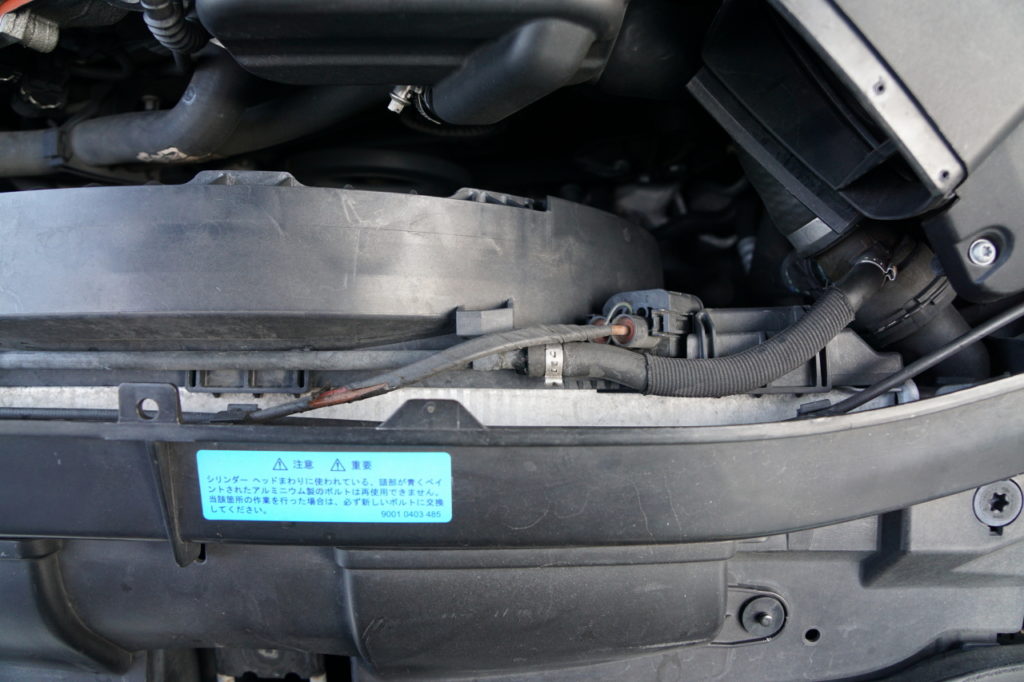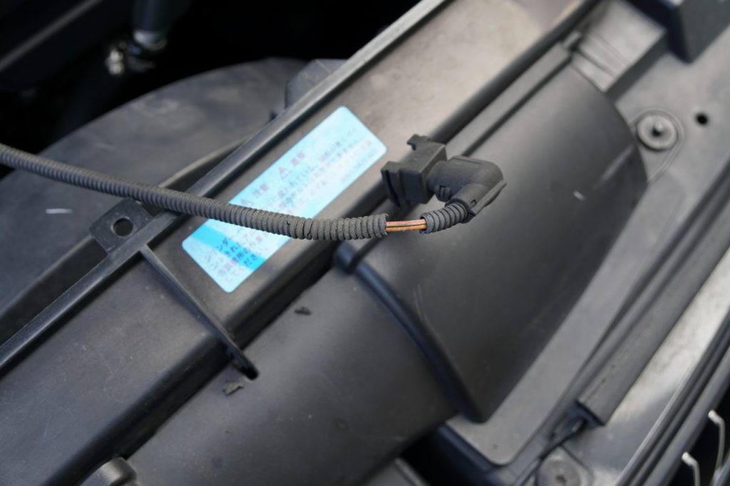 ラジエターに刺さる水温センサー?のケーブルを覆うテープが朽ちているのを発見。自己融着テープで補修しておいた。