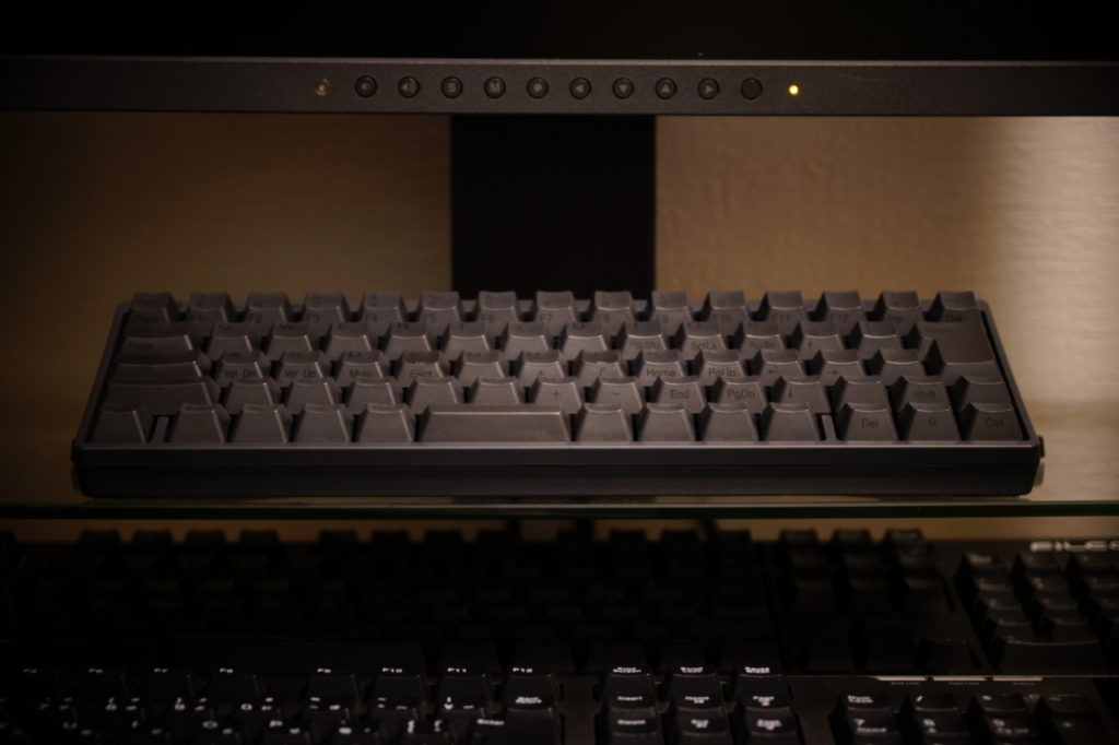 打鍵感は静電容量無接点式らしいスコスコ感があり、指先にへばりつく不思議な感覚。ただしリアルフォースはさらに魔法のようになめらかで快適かな、HHKBはカチャカチャ感が強い。 →小細工したら別物になった!