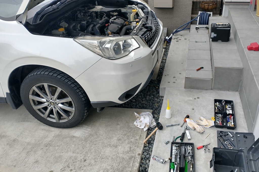 これまでレガシィB4(BE5)、インプレッサSTI(GDBA/GDBE)のプラグ交換の経験がある。水平対向エンジンはとにかく工具の選択が重要。作業しやすい運転席側から開始。