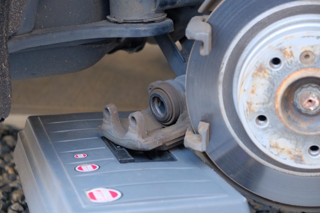 仕方なく裏からタイヤを蹴飛ばすこと数回。続いて、キャリパーケースを外す。