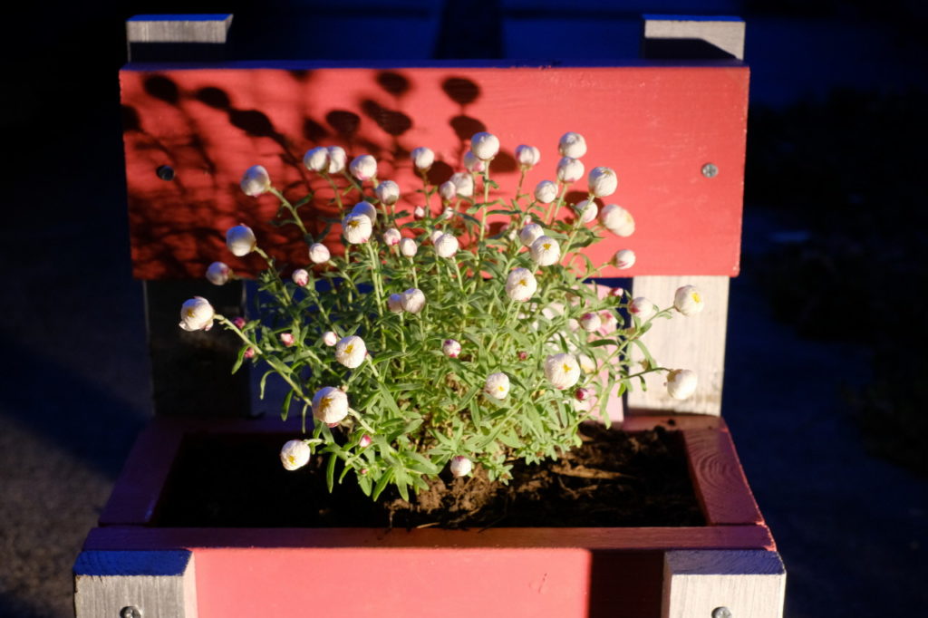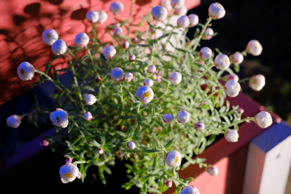 ホーム > 独り言 花かんざし オーストラリア原産の草花。 椅子型植木鉢に装填して育てている。 雨に弱いらしく、水やりも花や茎にはかけないようにするなどなかなかの曲者。 そんなだから直接雨粒のかからない軒下に置いているが、雨の日になると湿気を感じ取るらしく、一斉に花を閉じる姿がかわいい。そして、また晴れると花を開く。水が不足すると、頭を垂れる。 いろいろな表情を見せてくれる。 購入時 1週間後 花がパンパンに膨らんできて、開花。 可憐できれいなかたちをしている。 水が足りない様子。ピンボケのみんなが下を向いている。 雨の日、湿度の上昇を感知するのか、一斉に花を閉じる。 一生懸命に花を閉じている。晴れるとまた開くのが面白い。 カテゴリー:独り言 前の投稿 こいのぼり 次の投稿 6回目の車検