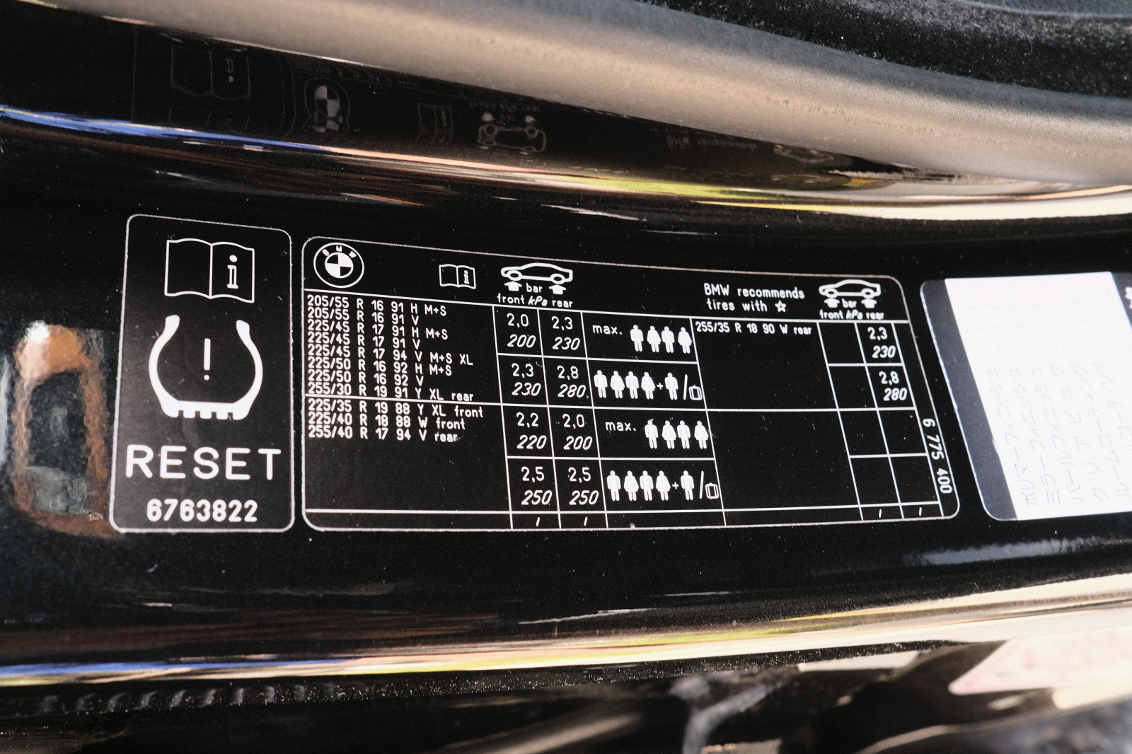 グレードにより多くのタイヤサイズがあって、かつ乗員や搭載物の量によっても指定空気圧が異なる。(良く見ると、人間の表示は男女で区別されているのが面白い。)