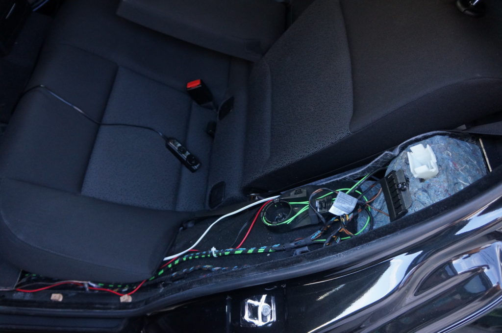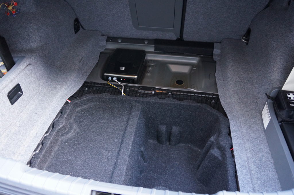 機能していることが信じられない純正のサブウーファーはフロントシートの下、床面に左右シートそれぞれ1つずつ埋め込まれている。ここから信号を取り出した。