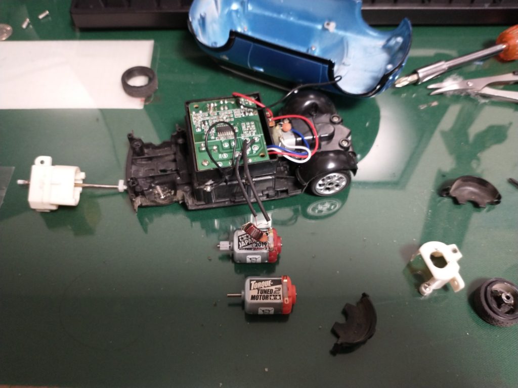 高速で走らせるようなラジコンでもないのに、ギヤも変えず(変えられず)高回転型モーターを積んでしまったものだから初期トルクが足りず、止まってばかりで満足に走らなくなってしまっていた。