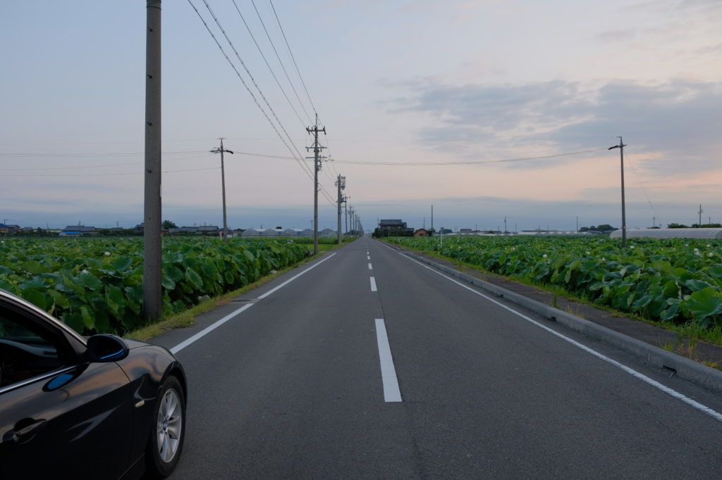 日の出前、とりあえずドライブを開始。レンコン畑のある西の方角へ向かった。