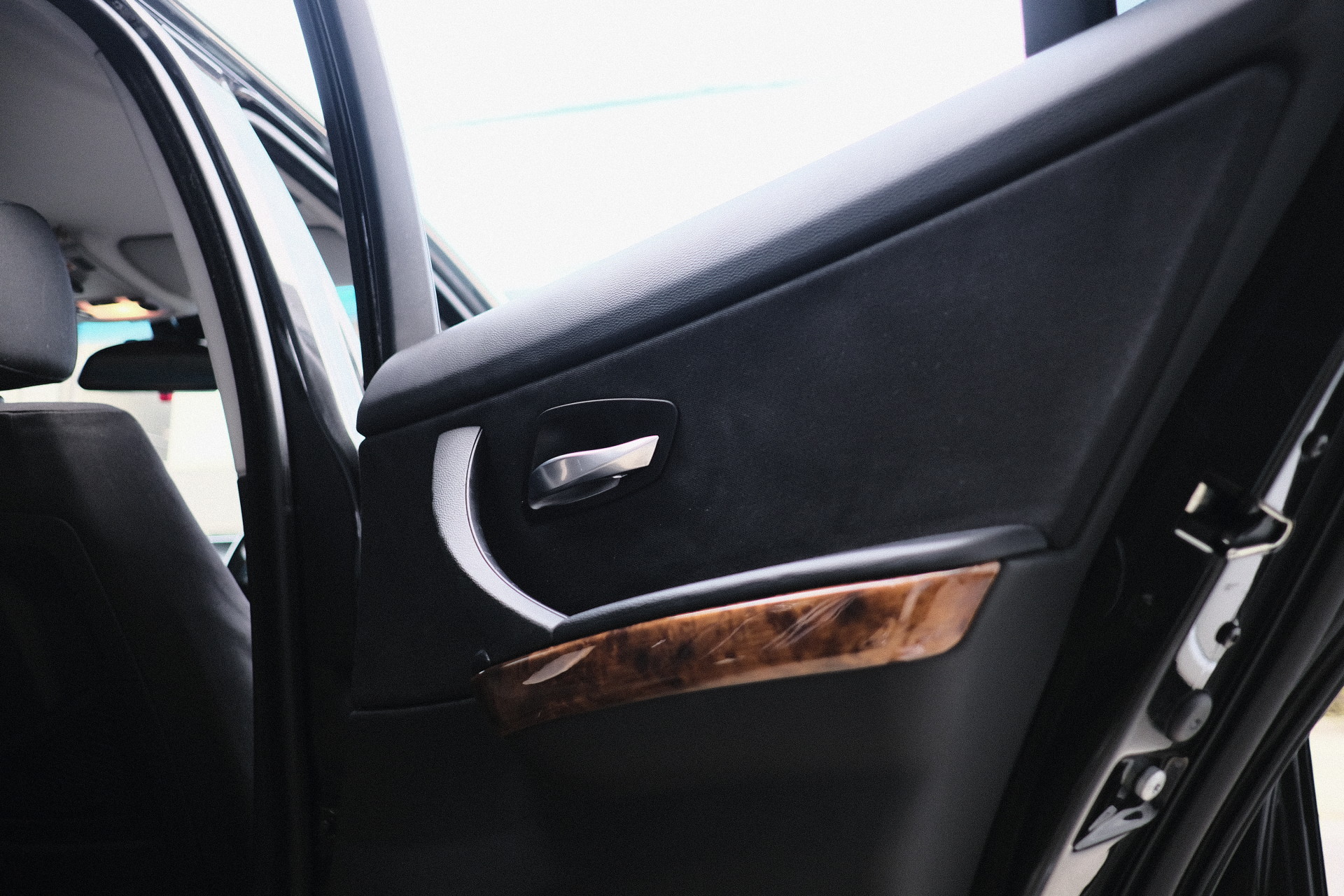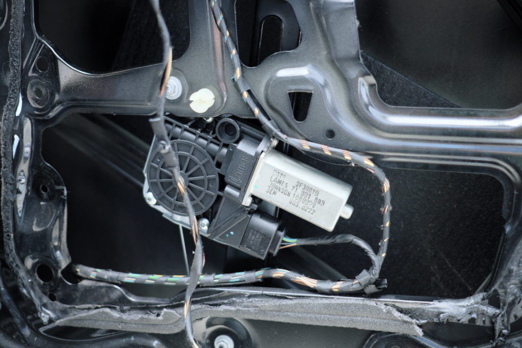 応急修理でドア内部に入れてある新聞紙を取り除き、レギュレータを仮固定、ウインドウガラスをレギュレータのフックにはめ込む。