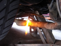 「人生一度はボクサーサウンドを体感しとかねば!」 そんな感じでを中古で購入。純正マフラーが錆びてボロボロという理由もあります。ただ「排気系をいじってパワーアップ!」とかいう意味合いは別にないです。 ![]() ノーマルとシムス. 出口の大きさなんか大して変わんない。 ![]() コレですコレ!! 当初自分で作業したけど、フランジ部が錆びて朽ち果ててボルトが原形を留めてなかったので外せなかった。 ![]() で、知り合いのF自動車さんに駆け込み、焼いてボルトを落としてもらうことに。 (おじさんありがとう!) ![]() すっごい火花!! おじさんは片手でタバコ吸いながら作業(笑) ![]() っとまぁ、 いとも簡単にあっさりと外れちゃった… ![]() 外れた純正マフラー。 錆び錆びで、そのうち穴が開きそうな感じ。 ![]() 純正可変バルブ。コイツともおさらばですが元々バルブを動かすワイヤー切れで不動(全開固定)だったので関係なし。 ![]() おじさん一瞬で装着。 チマチマと自分でいじるのもそれはそれで楽しいけど、やっぱりプロは違う(>_<) 交換後 ![]() レガシィ用のマフラーは多種ありますが、 ・爆音じゃない ・タイコが小さい(下に大きくはみ出ない) という2点がシムスのマフラーを選択した大きな理由でした。 実際取り付けてみた感じも、写真のようにタイコは地味で予想通り。ただ後ろにちょっと飛び出し気味になります(ディーラーも車検も OK だったんで無問題). 音について アイドリング時は軽く歯切れの良いとは言えない低音が響きます。2000-3000回転で走ってる時が一番うるさく、それ以上の回転域では大して純正と変わらないかも。シムスは高回転の抜けが悪いと聞くけど本当にそんな感じ。ただマフラーが完全に温まった後は幾分かうるさくなります(それでも爆音ではない)。 社外品にしてはおとなしい感じのマフラーです。 ボクサーサウンド自体がドコドコと低い音を奏でるだけなんでマフラー替えても上までカチ回したい気分にはならないですねぇ。